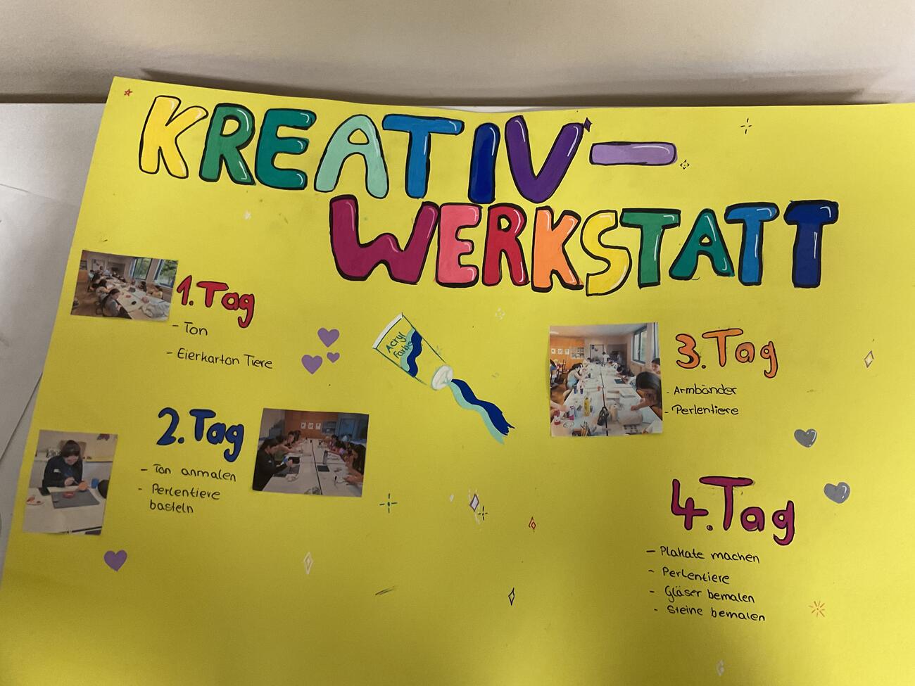 Im Kreativwerkstatt-Projekt von Frau Werner und von Frau Herr sind  wir am diesjährigen Projekttag nochmals vorbeigegangen und haben noch ein Interview gegen Ende durchgeführt. Die Gruppe hat einige Plakate vorbereitet, die am Schulfest im Flur ausgehängt werden.
