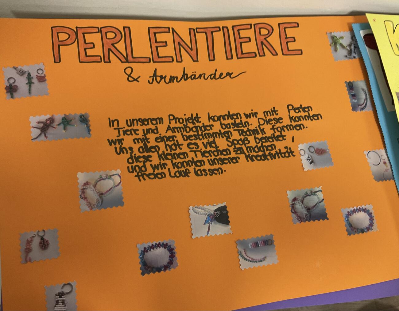 Insgesamt sind die Lehrerinnen sehr zufrieden mit den Erfolgen der Projektwoche. Frau Werners Lieblingsarbeiten waren die Perlentiere auf dem orangenen Plakat .