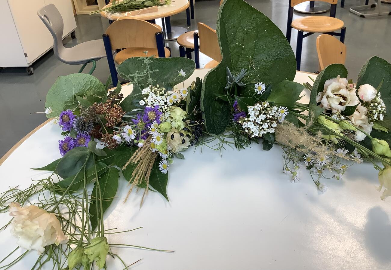 Die Leiterin der Garten-AG, Frau Treu, hat gekaufte Blumen mitgebracht, jedem von uns nur einen einzigen Stil mit Blüten gegeben. Unsere Aufgabe war es, aus im Schulgarten Vorhandenem einen kleinen Strauß zu zaubern. Also sind wir draußen herumgelaufen und haben gesucht, was es noch an Gräsern, Blättern, Kräutern und Blumen gibt. Wir haben erstaunlich viel gefunden. Dann ging's ans Sortieren, Zusammenstellen und schließlich ans Binden. Das war ein bisschen schwierig, weil die Stiele immer verrutscht sind. Wir haben unsere Sträuße bestimmt dreimal neu angefangen. Aber am Ende hat es geklappt! Wir haben die Sträuße unten mit einem Gummi festgebunden und dann das Ende der Stiele mit einer Schere auf die passende Länge abgeschnitten.