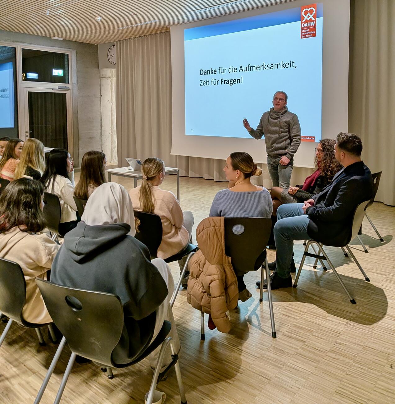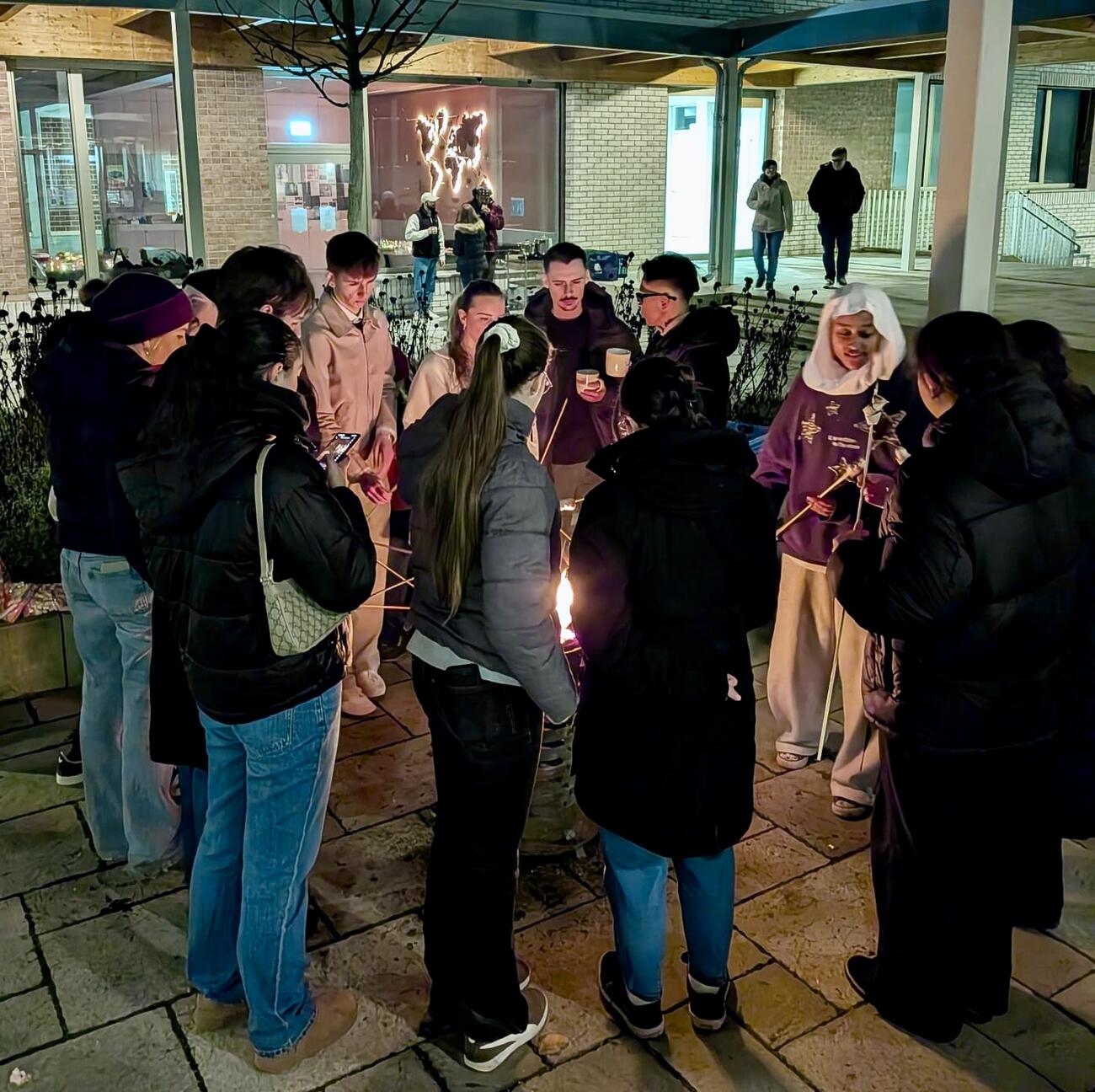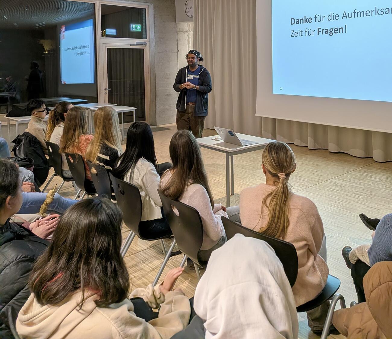 Gute Bildung ist wichtig. Aber was ist mit den Problemen, der Ungerechtigkeit und der Armut der Welt? „Da kann man ja eh nichts machen.“ DOCH! Kann man. Und wie das geht, darüber berichtete der CEO der Hilfsorganisation DAHW, Patrick Georg, im Rahmen einer gemütlichen Weihnachtsfeier am 15.12.2025 hier bei uns am GMB. Die vom ehemaligen Mosbacher-Berg-Lehrer ins Leben gerufene Junge DAHW hatte Schülerinnen und Schüler des Mosbacher Bergs und der Gutenbergschule zu diesem Abend eingeladen. Es wurden bei Punsch am Feuer Würste gegrillt, Stockbrot und Marshmellows gebacken, Kekse verziert und viel über die Möglichkeiten diskutiert, unsere Welt durch ganz kleine Schritte ein bisschen besser zu machen.