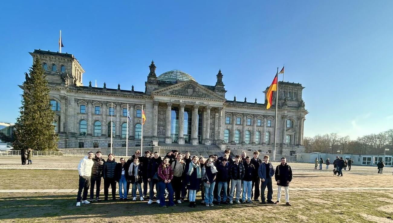 Am 17.12.25 unternahmen die beiden Leistungskurse Politik und Wirtschaft der Jahrgangsstufe 12 von Herrn Esslinger und Herrn Reinmüller eine Eintagesexkursion nach Berlin. Die Fahrt fand auf Einladung des Wiesbadener Wahlkreisabgeordneten Dr. Korbach statt und bot den Schülerinnen und Schülern die Möglichkeit, politische Prozesse nicht nur theoretisch im Unterricht zu behandeln, sondern sie vor Ort unmittelbar zu erleben.