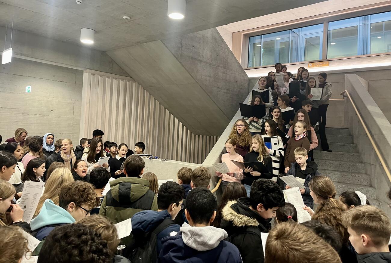 Unsere Musiker/-innen haben es wieder geschafft, uns musikalisch beschwingt beim gemeinsamen Singen von Weihnachtsliedern in die Ferien zu geleiten. Zunächst gaben der Chor und das Vokalensemble von Frau Rübsam im Foyer des V-Baus ihr Bestes.