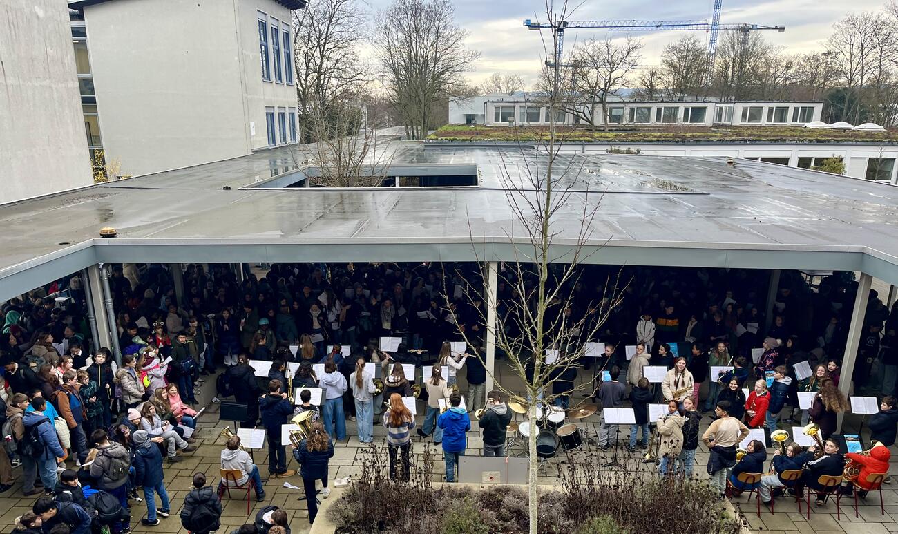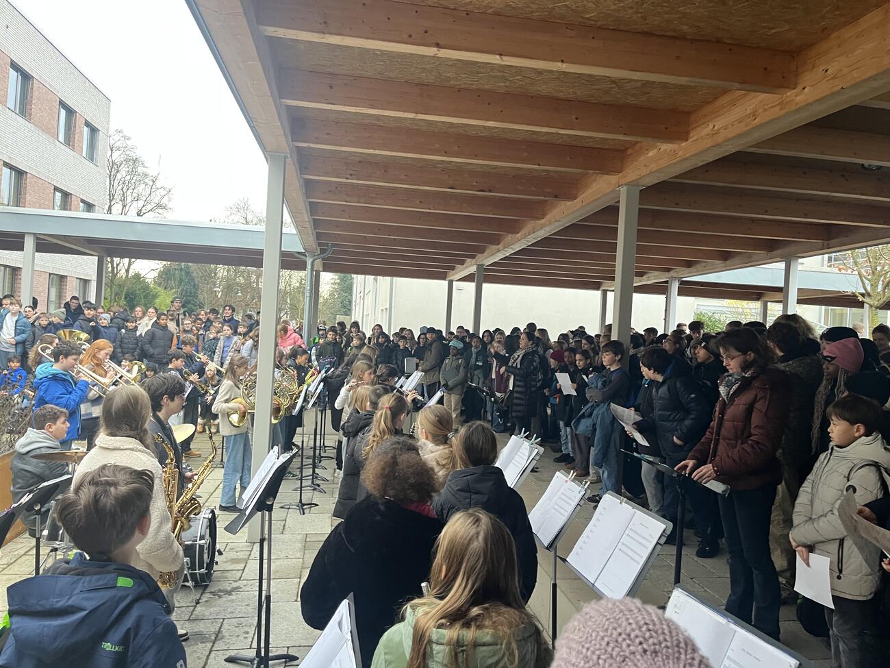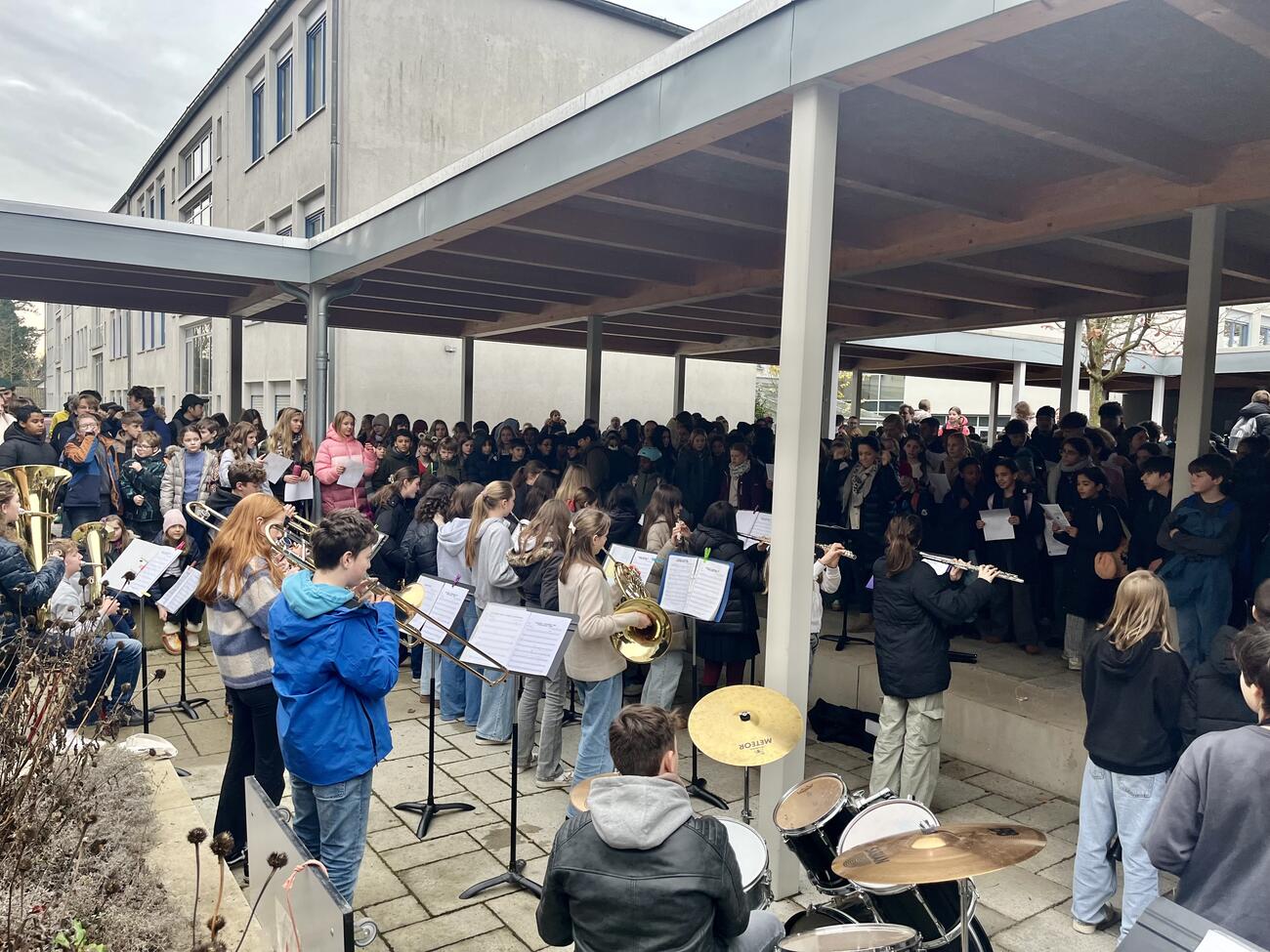 Anschließend warfen sich dann die Bläser unter der Leitung von Frau Glocker und Frau Schneider outdoor ins Zeug, um die ganze Schulgemeinde einzustimmen auf die anstehende Weihnachtszeit.