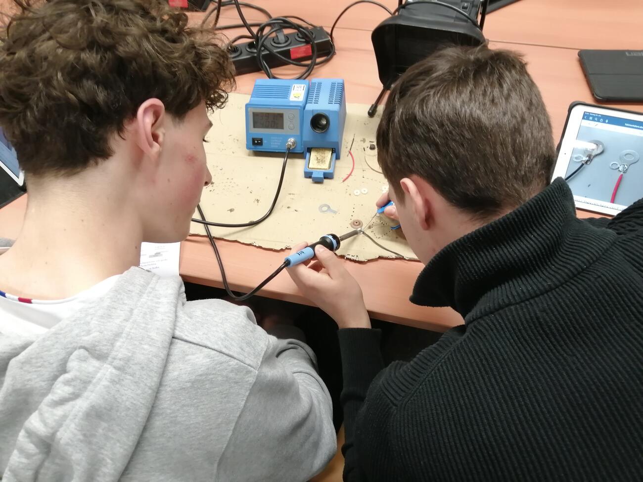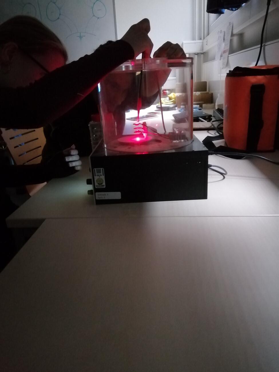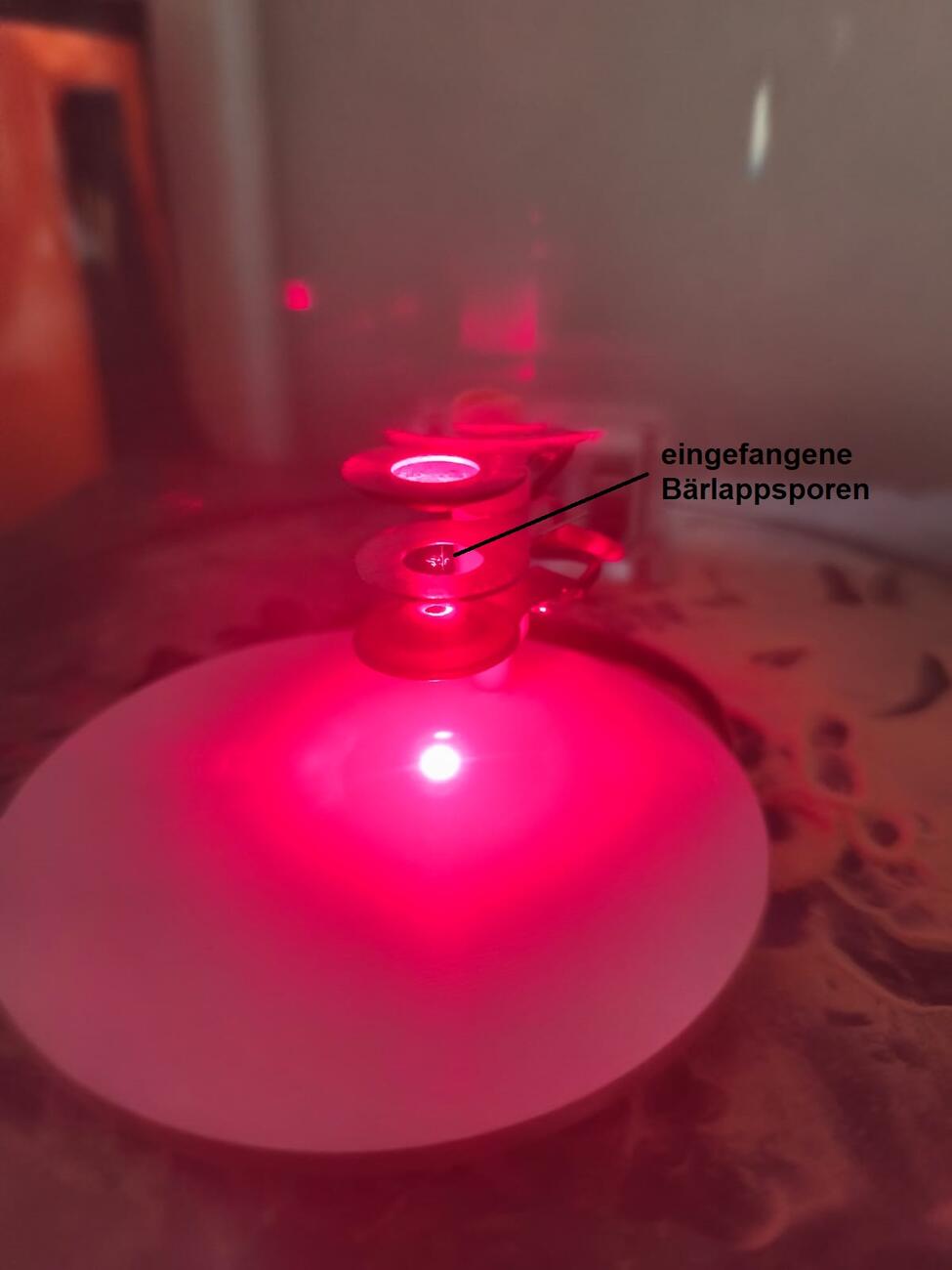 Nach einer Einführung war die Neugier geweckt: Die Schülerinnen und Schüler bauten ihre eigenen Teilchenfallen. Mit viel Engagement wurde gelötet, geschraubt und ausprobiert, bis schließlich die ersten Testläufe starten konnten. Als Teilchen kamen elektrisch geladene Sporen der Pflanze „Bärlappe“ zum Einsatz. Der Erfolg ließ nicht lange auf sich warten: Im Licht eines Lasers waren die schwebenden Sporen deutlich zu erkennen.