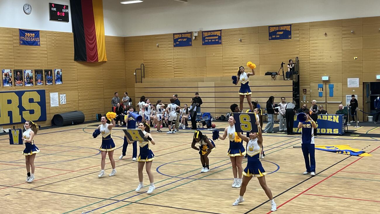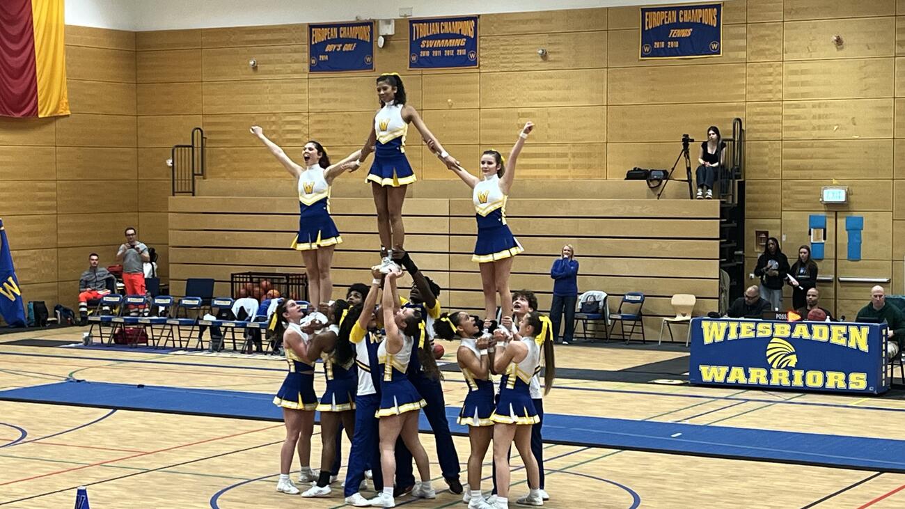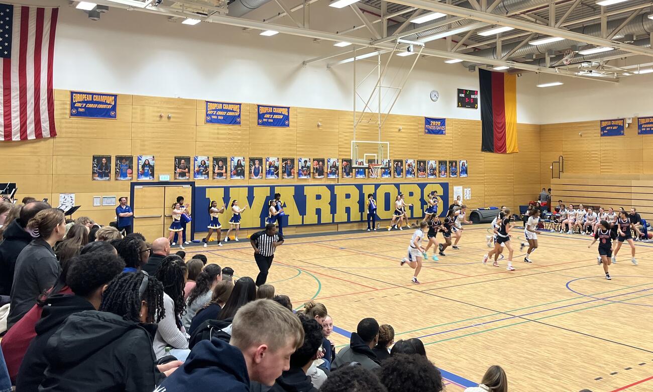 Beim Betreten der Turnhalle durften wir das erleben, was Freitag Abends zur gleichen Zeit an rund 5000-15000 High Schools in den USA parallel stattfindet: Ein Sportfest der Schulgemeinde mit Cheerleading, Band und gut gefüllter Turnhalle. Wir wurden überwältigt von der Geräuschkulisse, der amerikanischen Lebensfreude und der fantastischen Inszenierung der Baskettballspiele zweier Varsity Teams der 'Wiesbaden Warriors'. Neben einer Schulband durften die Cheerleaders nicht fehlen. Sportlich wurden wir - bis in die späten Abendstunden - Zeugen von sehr ansprechendem Nachwuchsbasketball und somit bestens unterhalten. Die „Wiesbaden Warriors“ spielten gegen eigens aus England (nördlich von Cambridge) angereiste amerikanische Varsity Teams, die ihre eigenen Fans und Cheerleaders mitgebracht hatten. Sportlich ließen die 'Wiesbaden Warriors' ihren Gästen keine Chance, die aber auch reisebedingt auf ihren Schlaf verzichten mussten.
