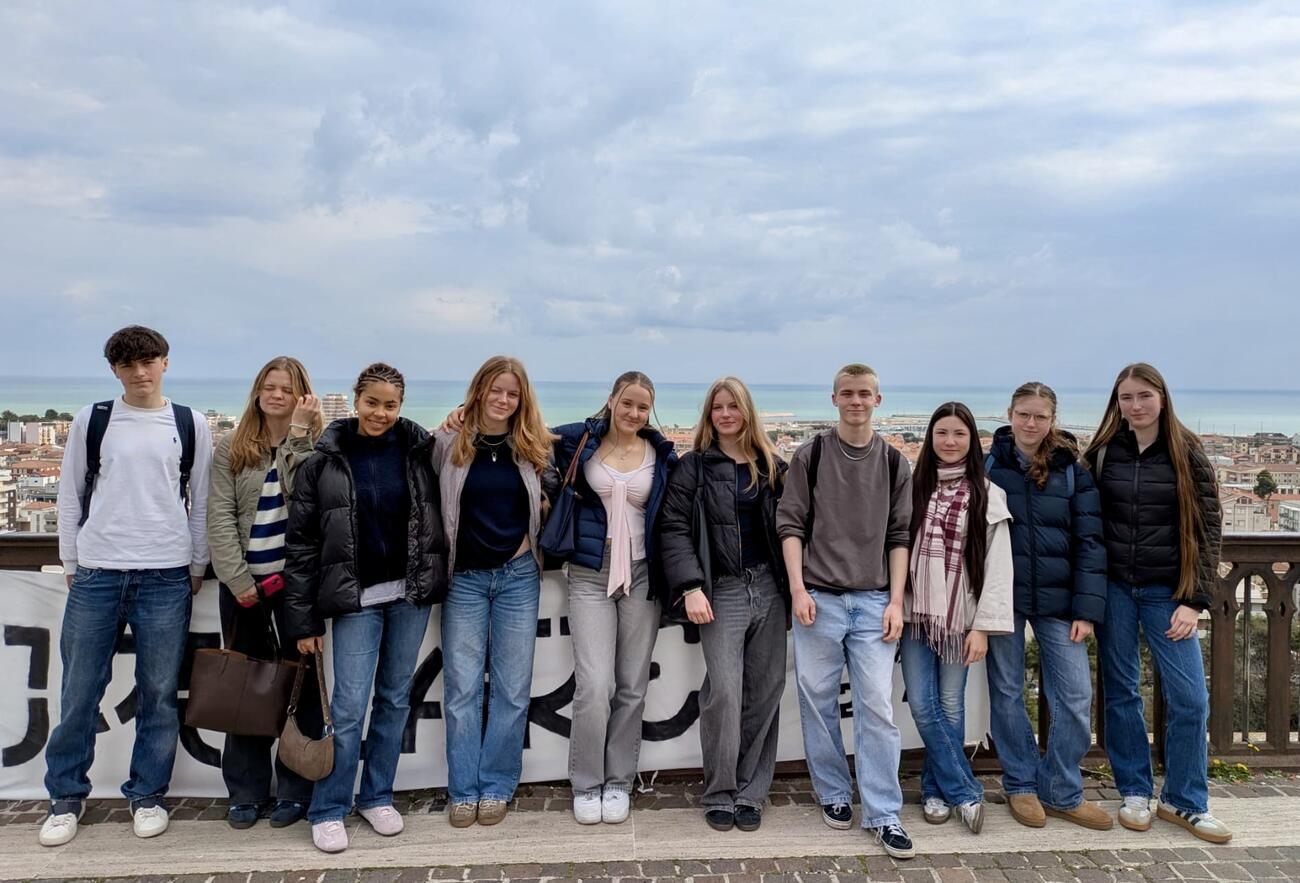 Italienisch hören, sprechen – und vor allem erleben: Für zehn Schülerinnen und Schüler der 10. Klassen des Gymnasium am Mosbacher Berg ist genau das gerade Realität. Gemeinsam mit ihren Italienischlehrerinnen Frau Del Conte und Frau Brömser sind sie zu Gast an der Partnerschule Liceo Statale Marie Curie in der Adriastadt Giulianova.