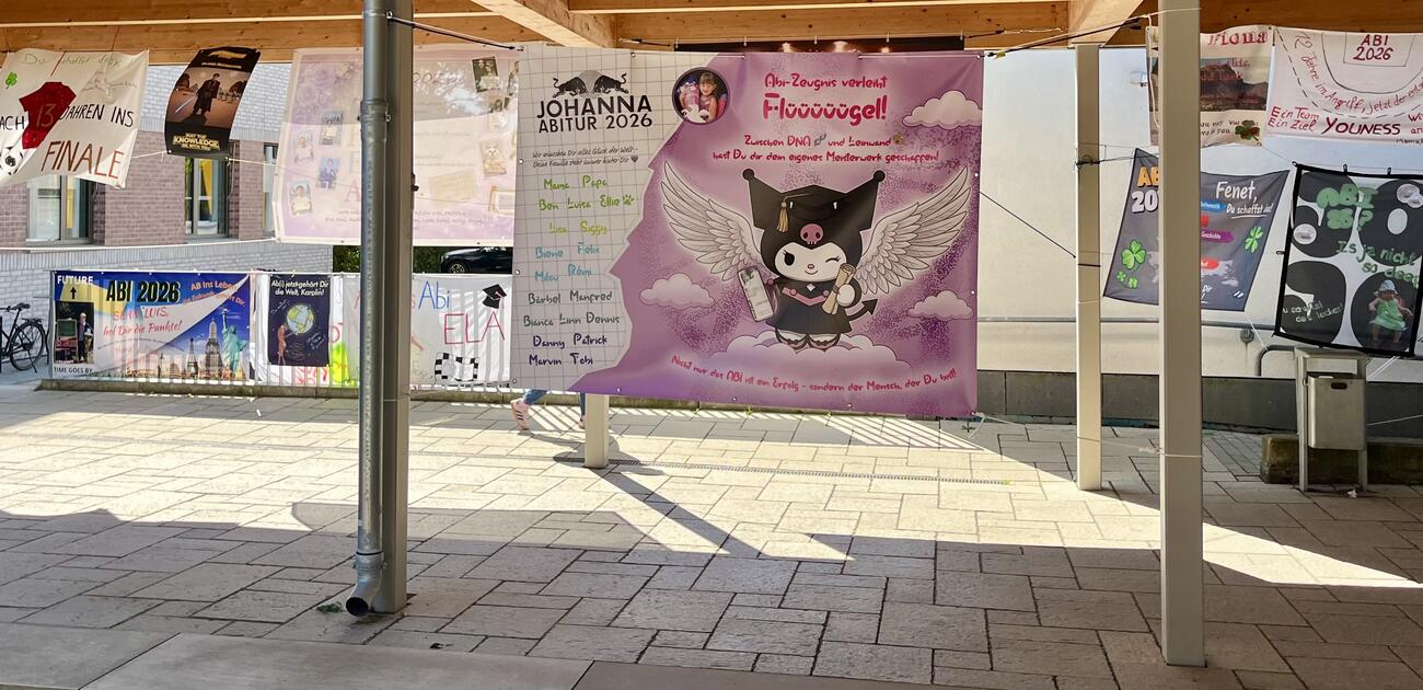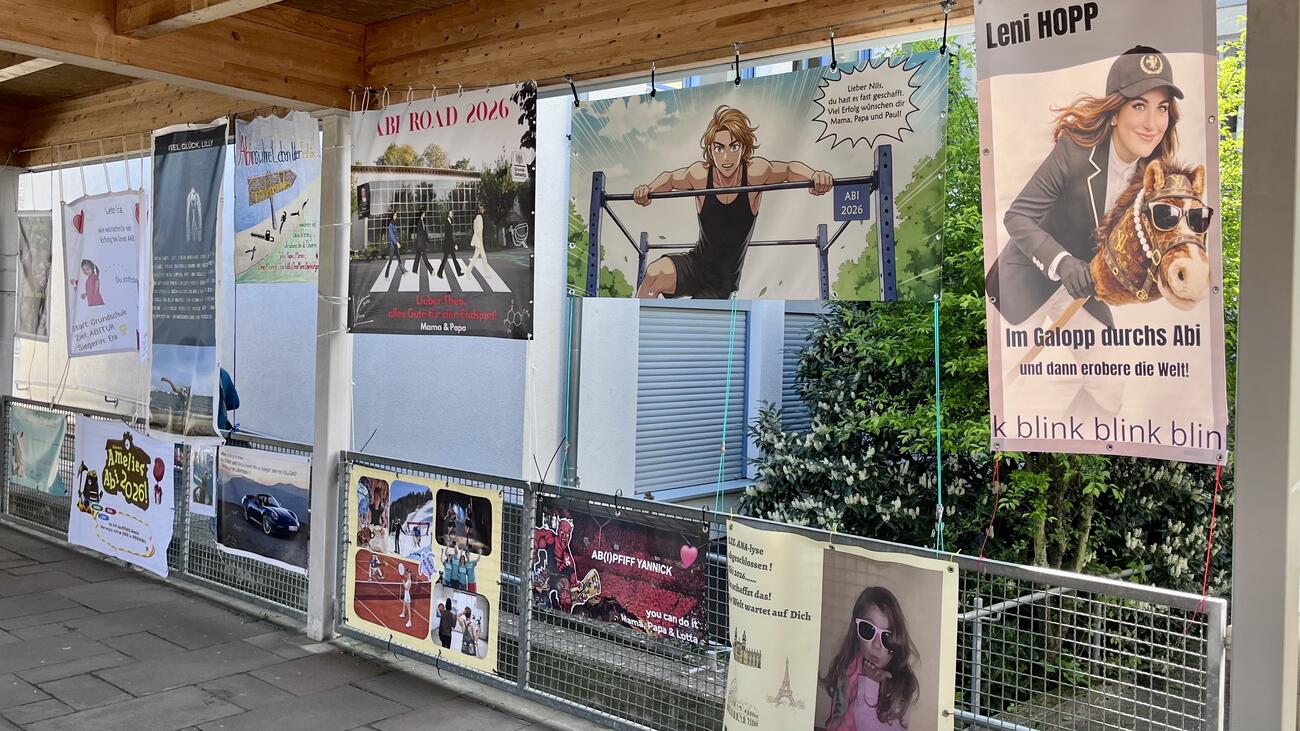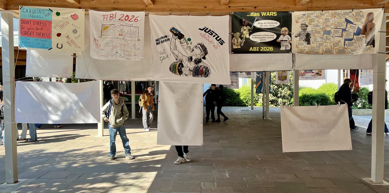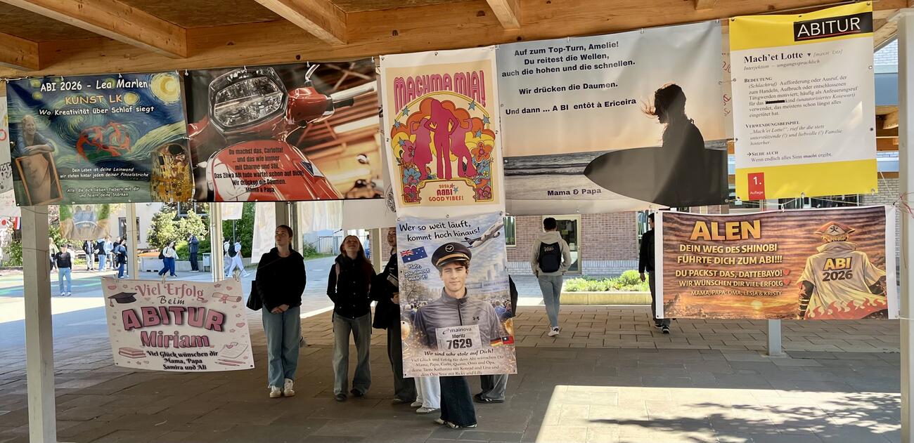 Am Mittwoch, den 15.4.2026 fällt der Startschuss für unsere diesjährigen Abiturient/-innen mit dem schriftlichen Abitur. Auch in diesem Jahr hängen die Plakate, die meistens Eltern, Geschwister, Oma & Opa oder Freunde erstellt haben, regengeschützt unter der Pausenhofüberdachung.