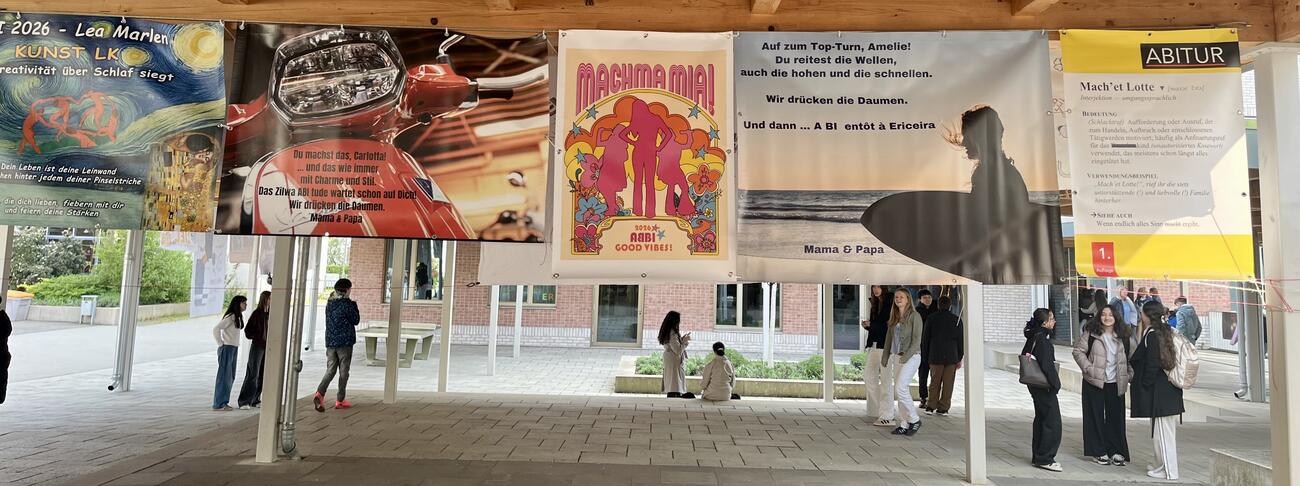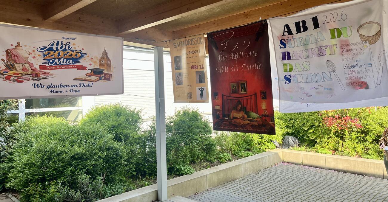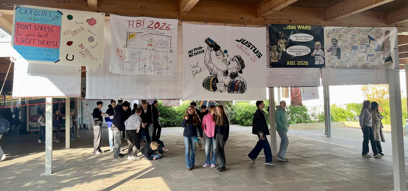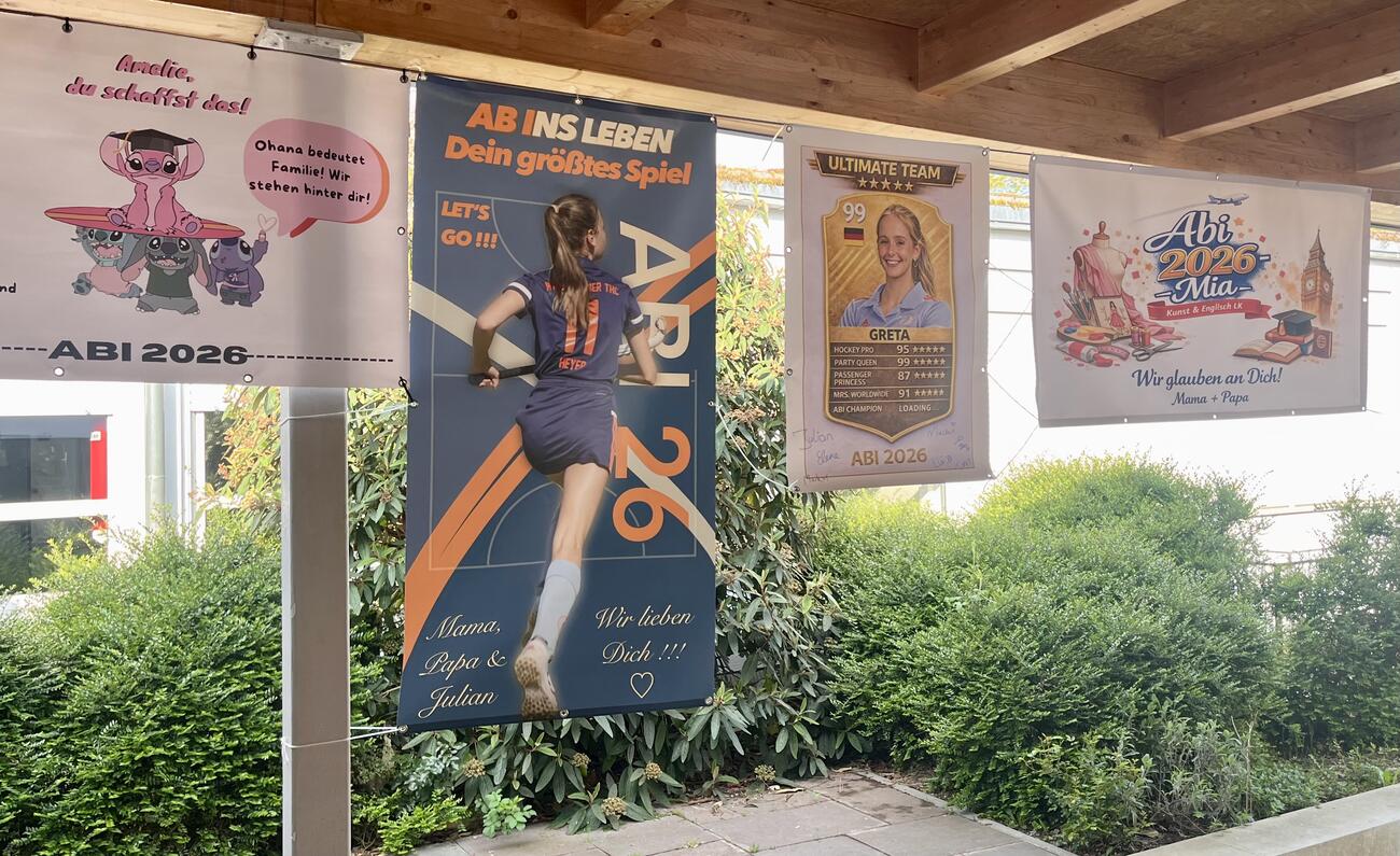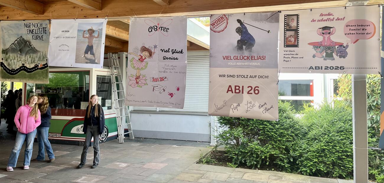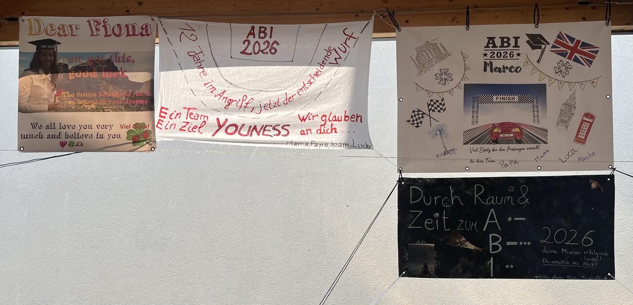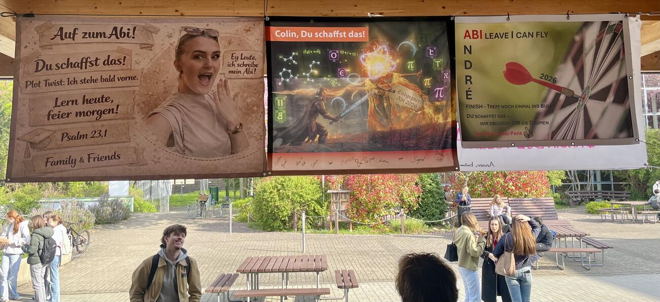 Am Mittwoch, den 15.4.2026 fällt der Startschuss für unsere diesjährigen Abiturient/-innen mit dem schriftlichen Abitur. Auch in diesem Jahr hängen die Plakate, die meistens Eltern, Geschwister, Oma & Opa oder Freunde erstellt haben, regengeschützt unter der Pausenhofüberdachung.