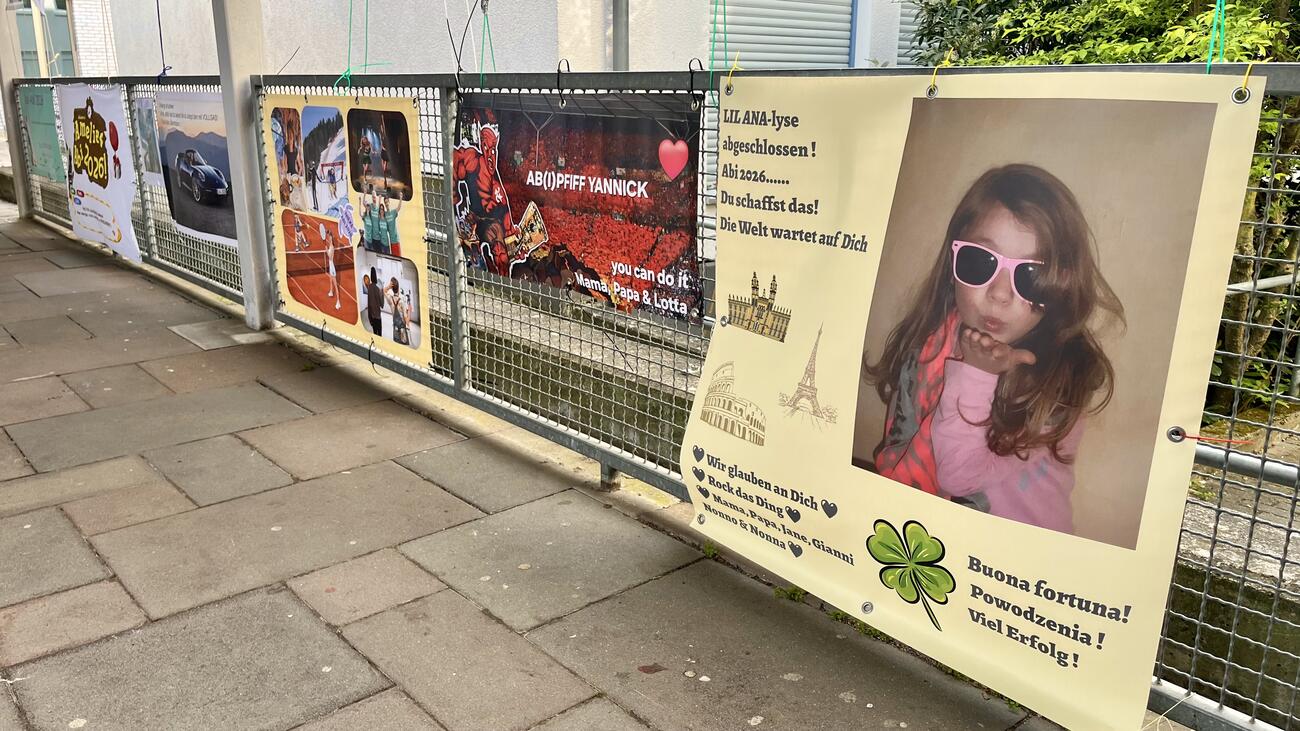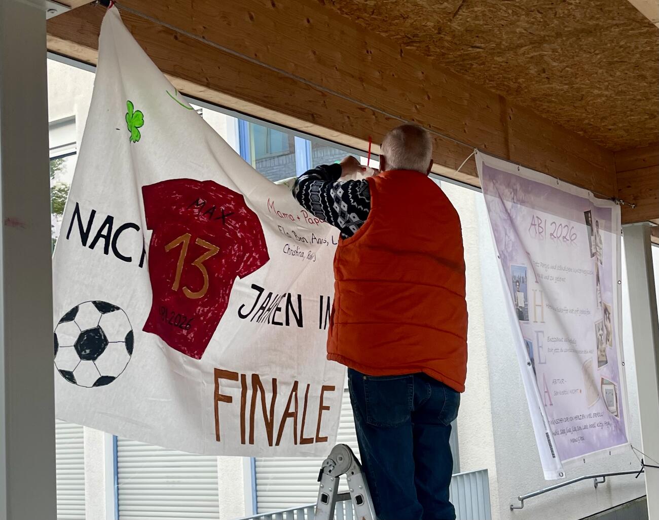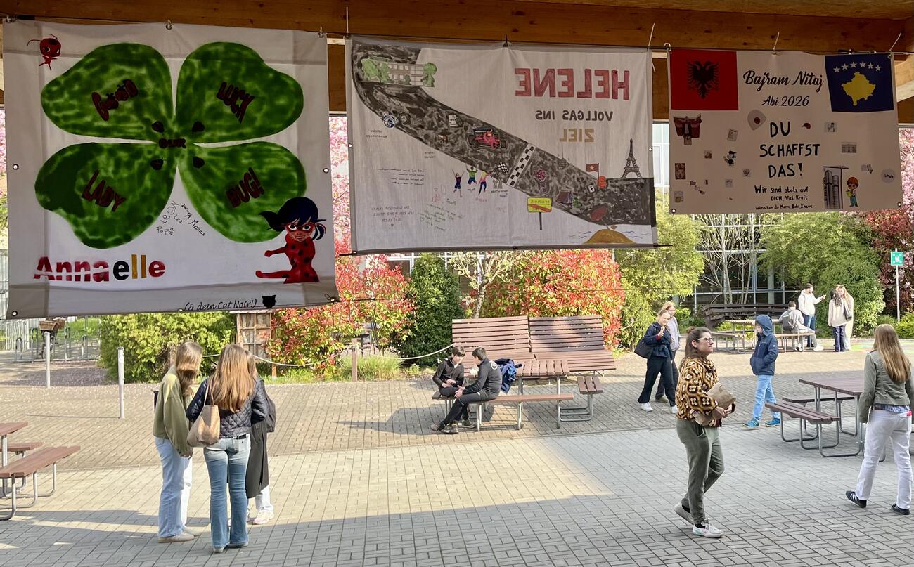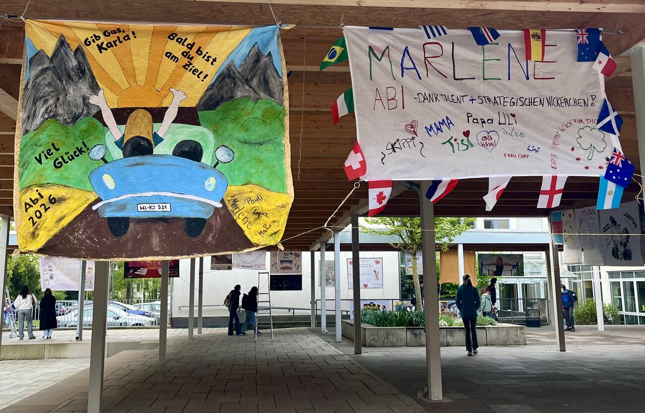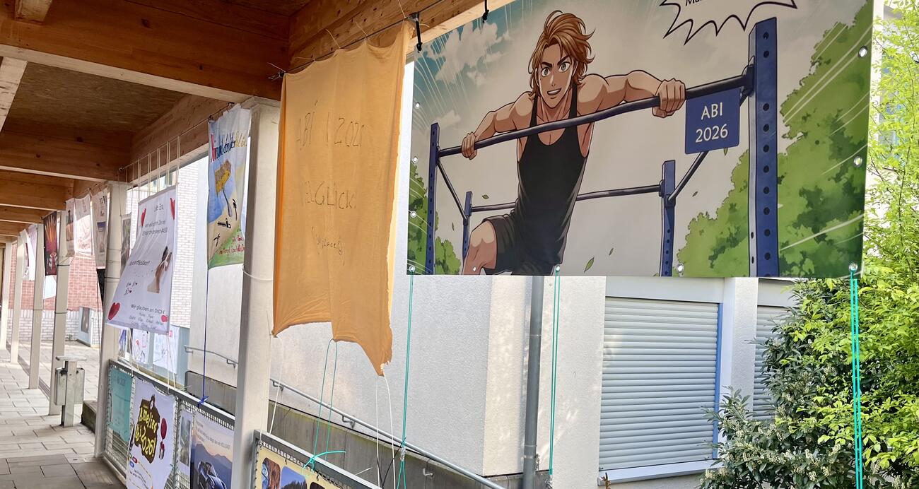 Am Mittwoch, den 15.4.2026 fällt der Startschuss für unsere diesjährigen Abiturient/-innen mit dem schriftlichen Abitur. Auch in diesem Jahr hängen die Plakate, die meistens Eltern, Geschwister, Oma & Opa oder Freunde erstellt haben, regengeschützt unter der Pausenhofüberdachung.